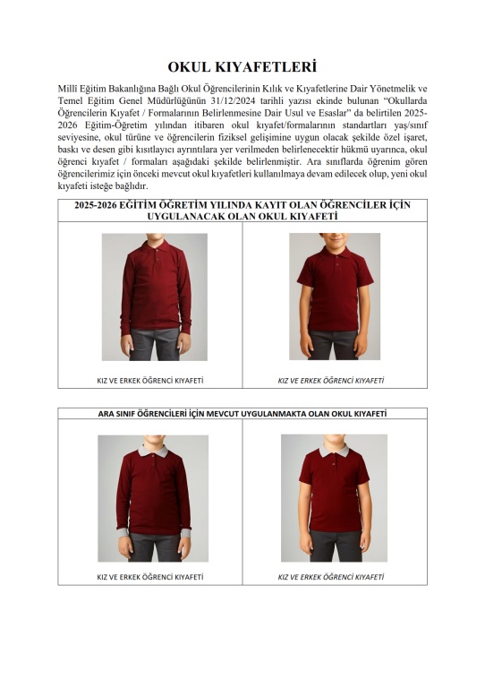 2025-2026 EĞİTİM ÖĞRETİM YILINDA KAYIT OLAN ÖĞRENCİLER İÇİN UYGULANACAK OLAN OKUL KIYAFETİ |